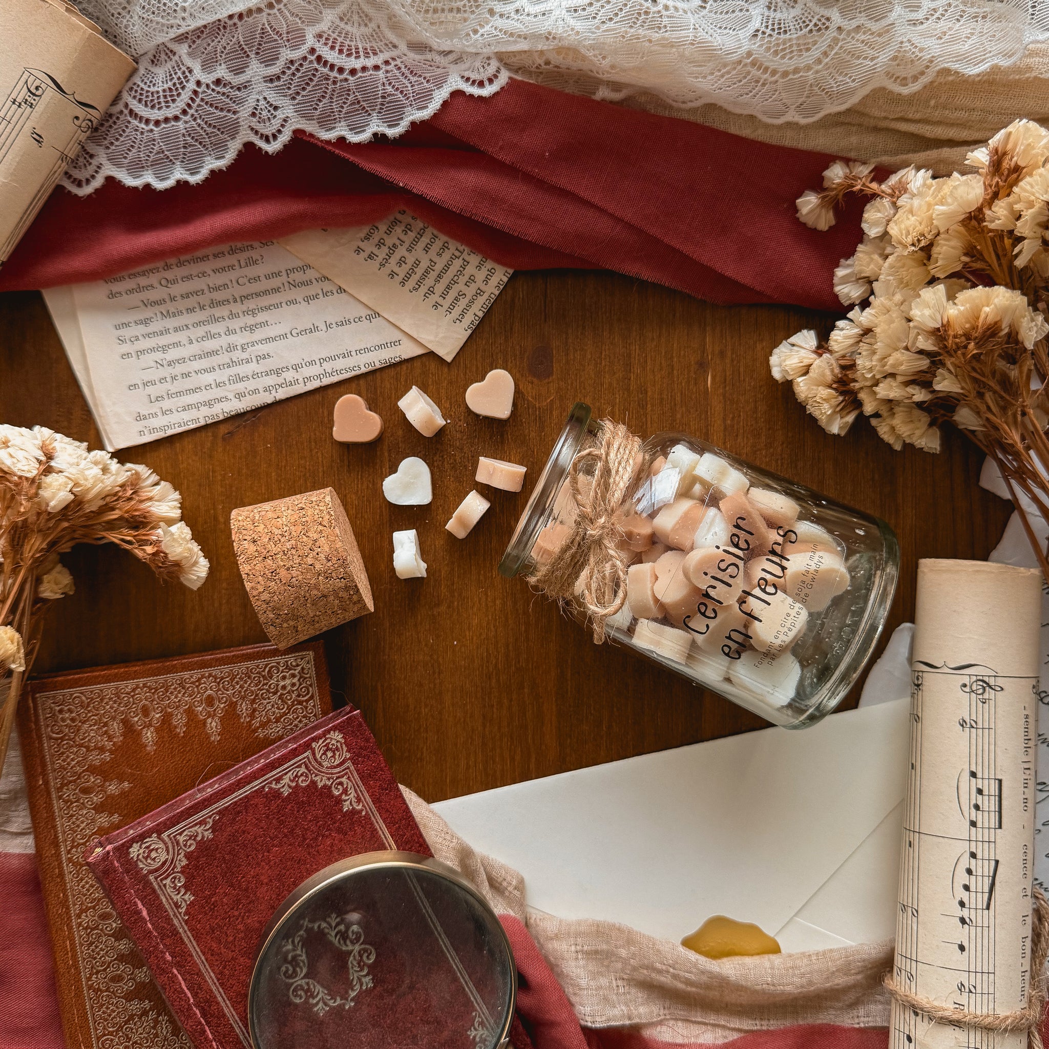 Fondants à base de cire de soja à la fragrance Cerisier en fleurs en forme de petits coeurs.