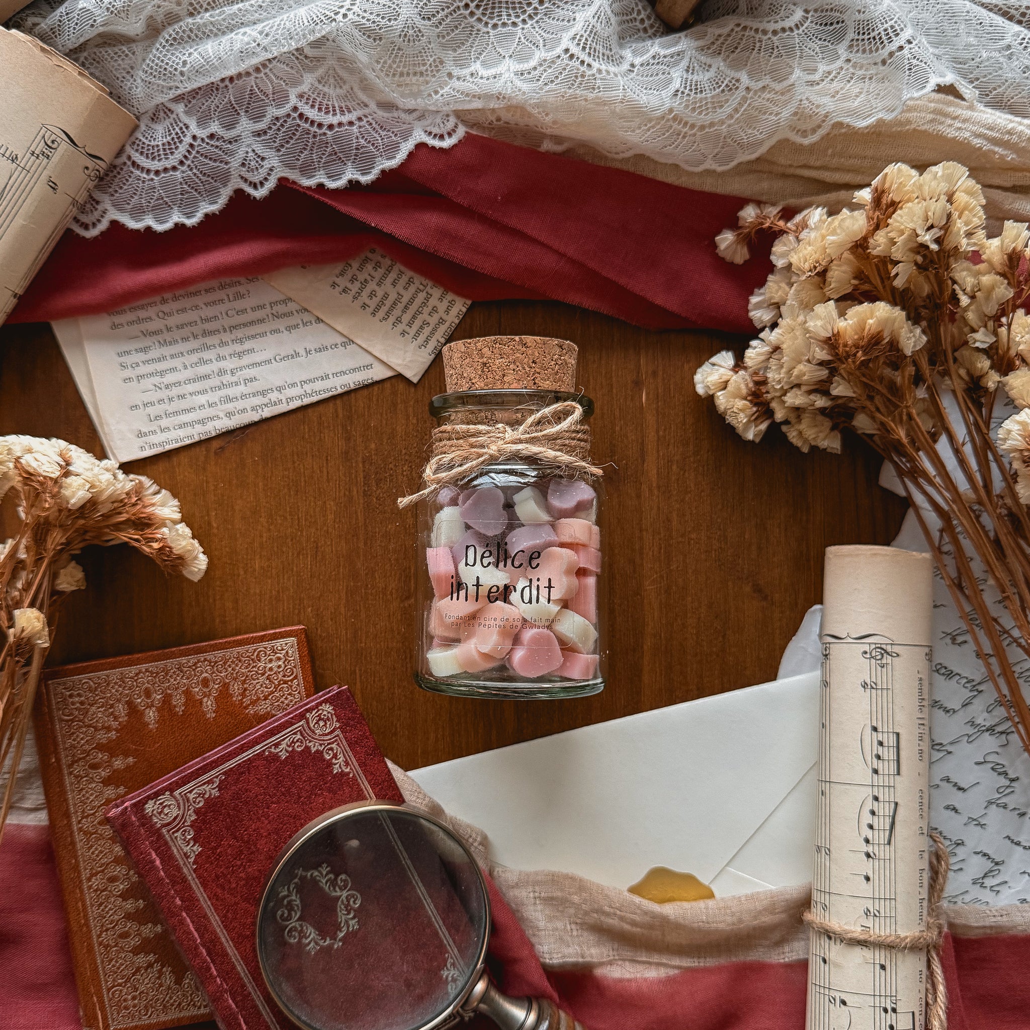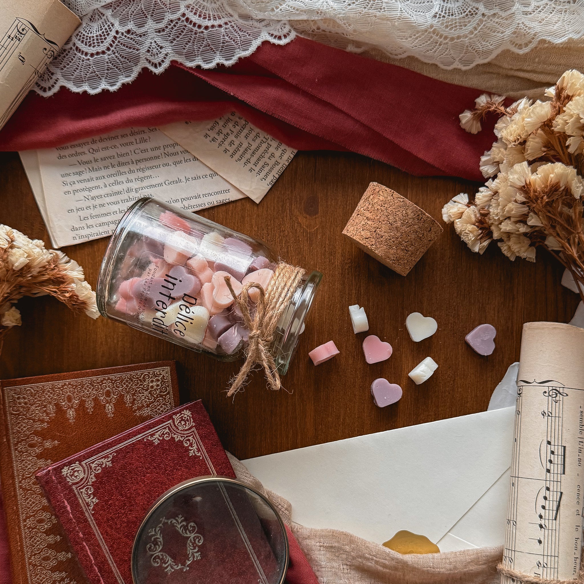 Fondants à base de cire de soja à la fragrance Délice interdit en forme de petits coeurs.