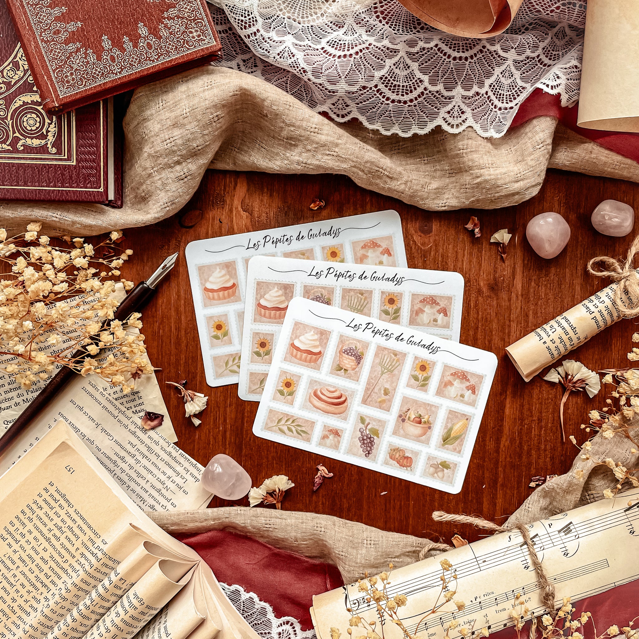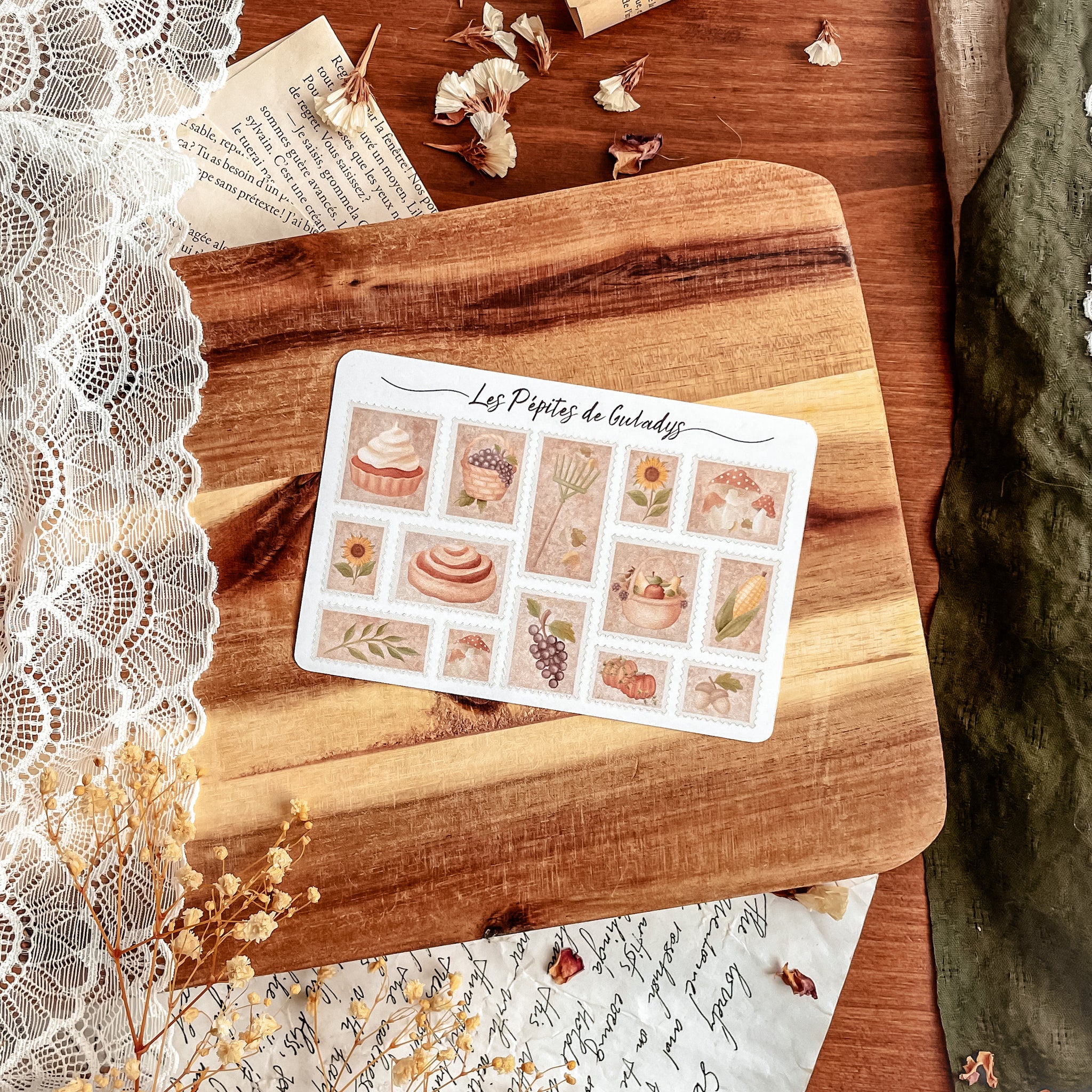 Retrouvez 14 timbres vintage de la collection "Marché d'Automne" sur cette planche de stickers.