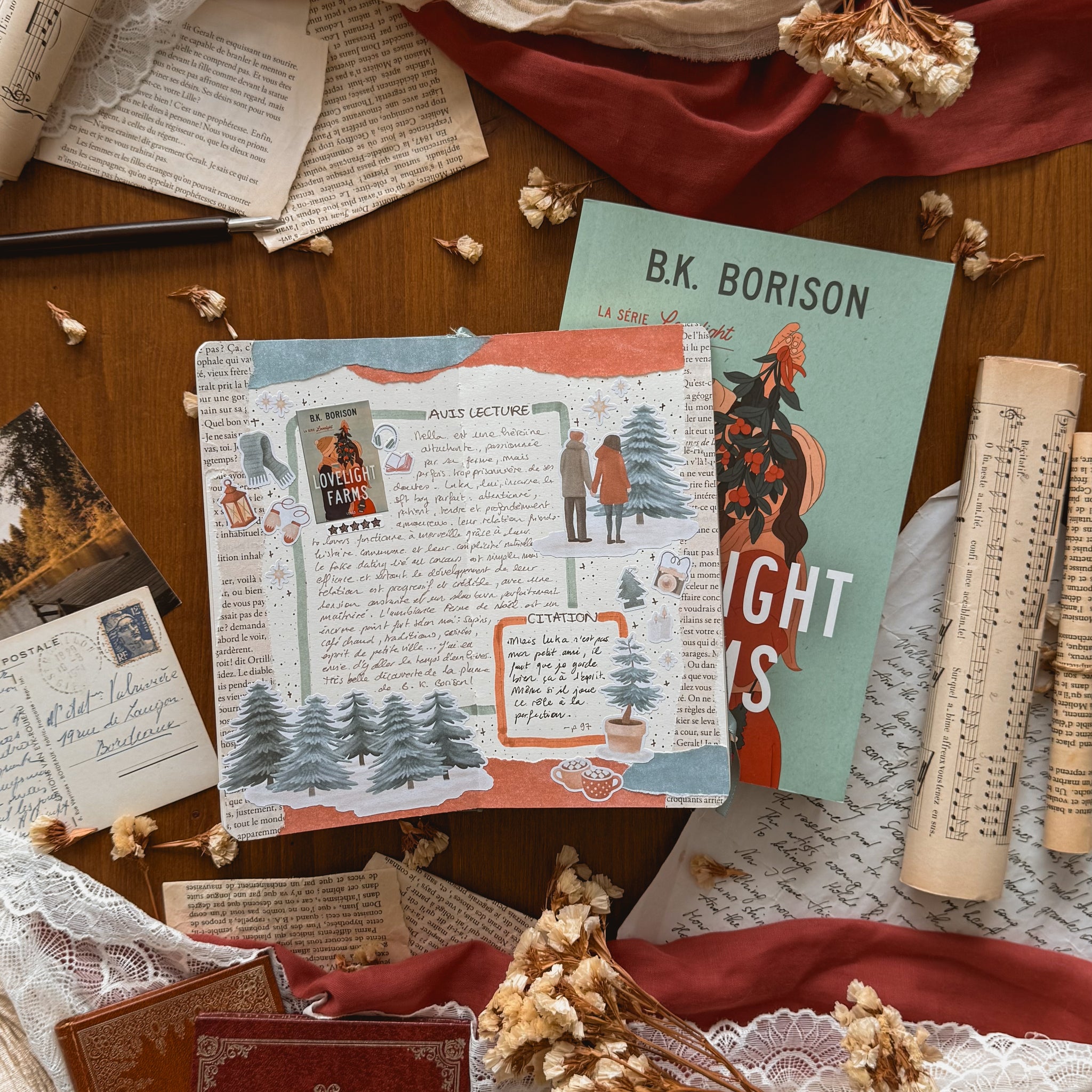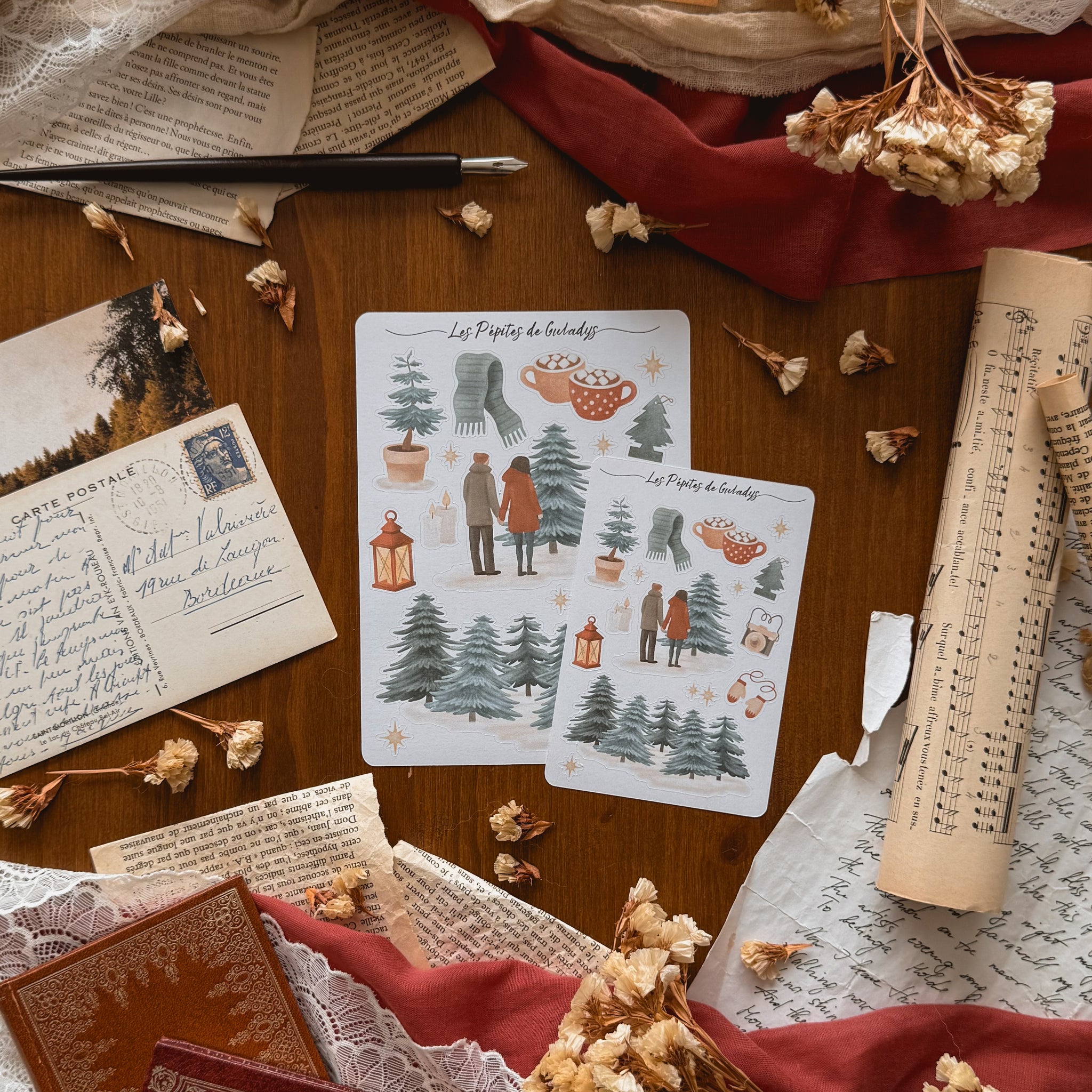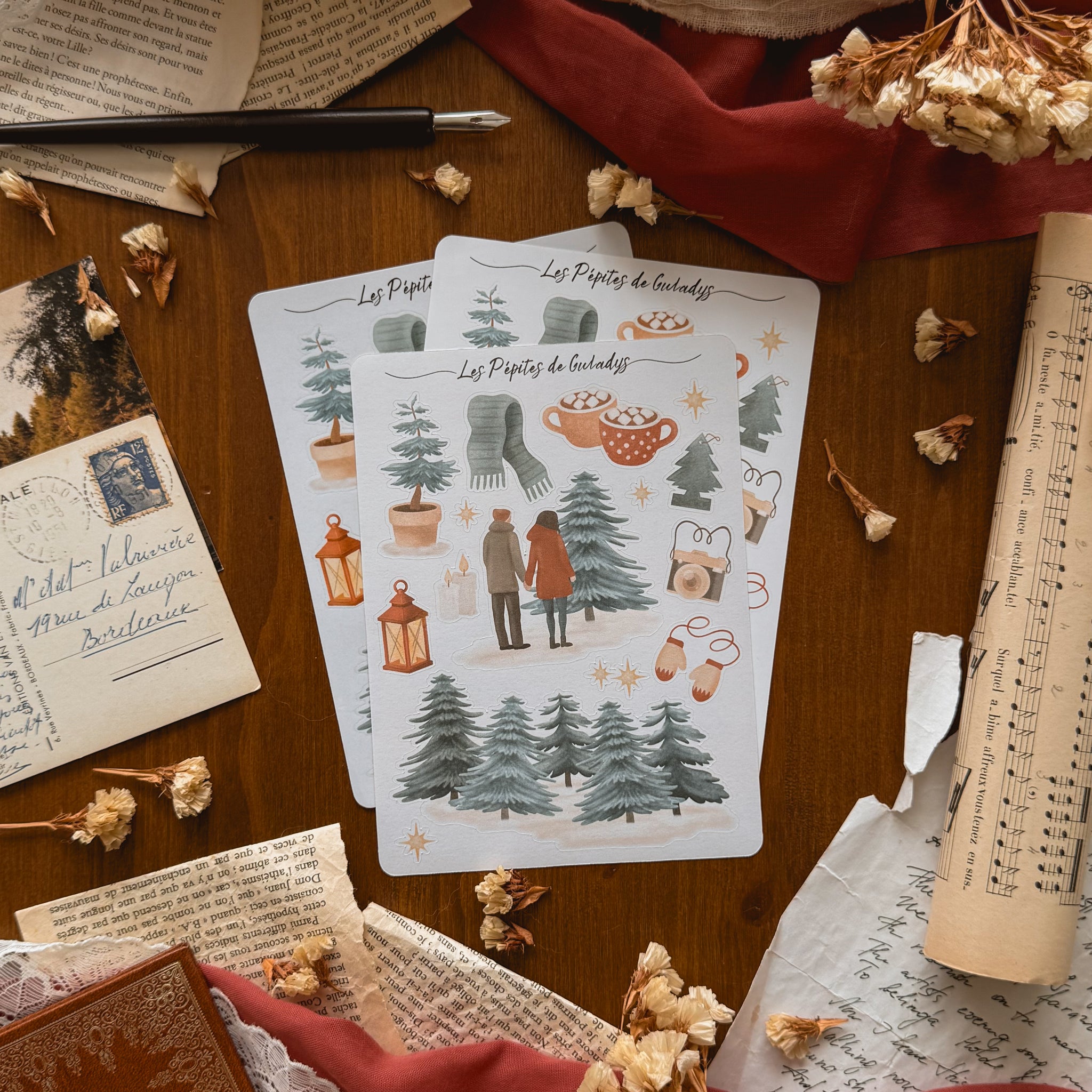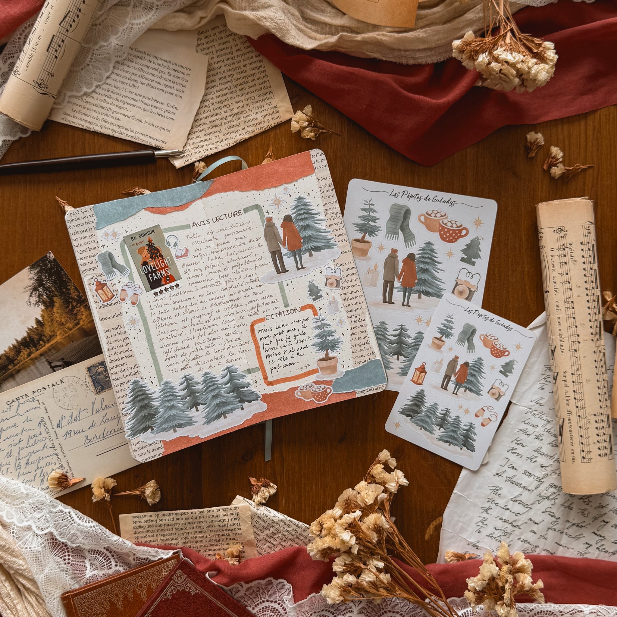 Une planche de stickers aux accents cosy et hivernaux, inspirée des fermes de sapins et des romances doudou . Parfaite pour illustrer vos carnets de lecture, bullet journaux et pages scrapbooking ✨
