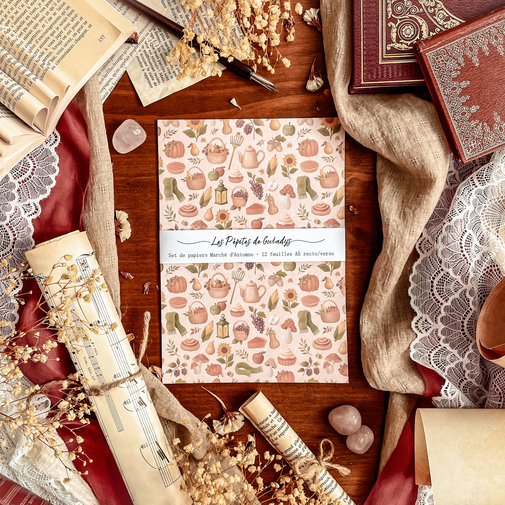 Set de papiers créatifs de la collection "Marché d'Automne", parfait pour le scrapbooking. Papier non collant 90 g/m².